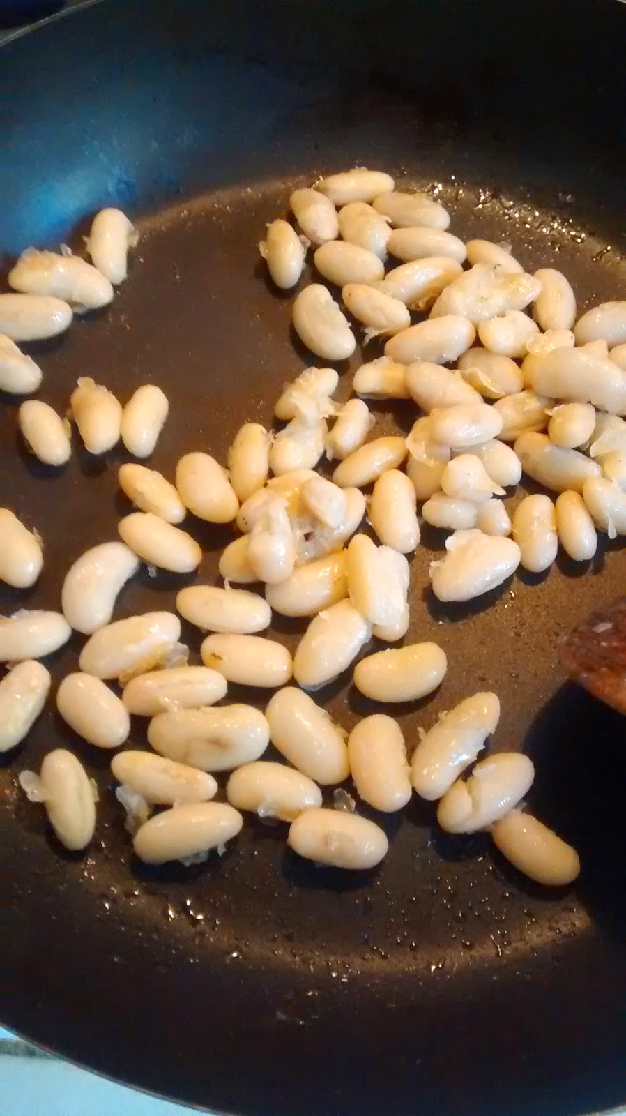 Once you've got the beans cover, dump in the spinach and turn off the heat. Use the residual heat in the pan to wilt the spinach down, and be careful when stirring as the spinach can and will go everywhere.